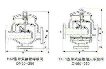HXF2带双接管呼吸阀根据国家标准《石油化工企业设计防火规范》(GB50160-92)之规定:甲、乙类液体的固定顶罐,应设阻火器和呼吸阀。可见呼吸阀、阻火器是储罐不可缺少的安全设施。它不仅能维持储罐气压平衡,确保储罐在超压或真空时免遭破坏,且能减少罐内介质的挥发和损耗。上海成都俊熙饮品调配技术有限公司厂生产的呼吸阀,具有结构紧凑、通气量大、泄漏量小、密封性能好等特点。
